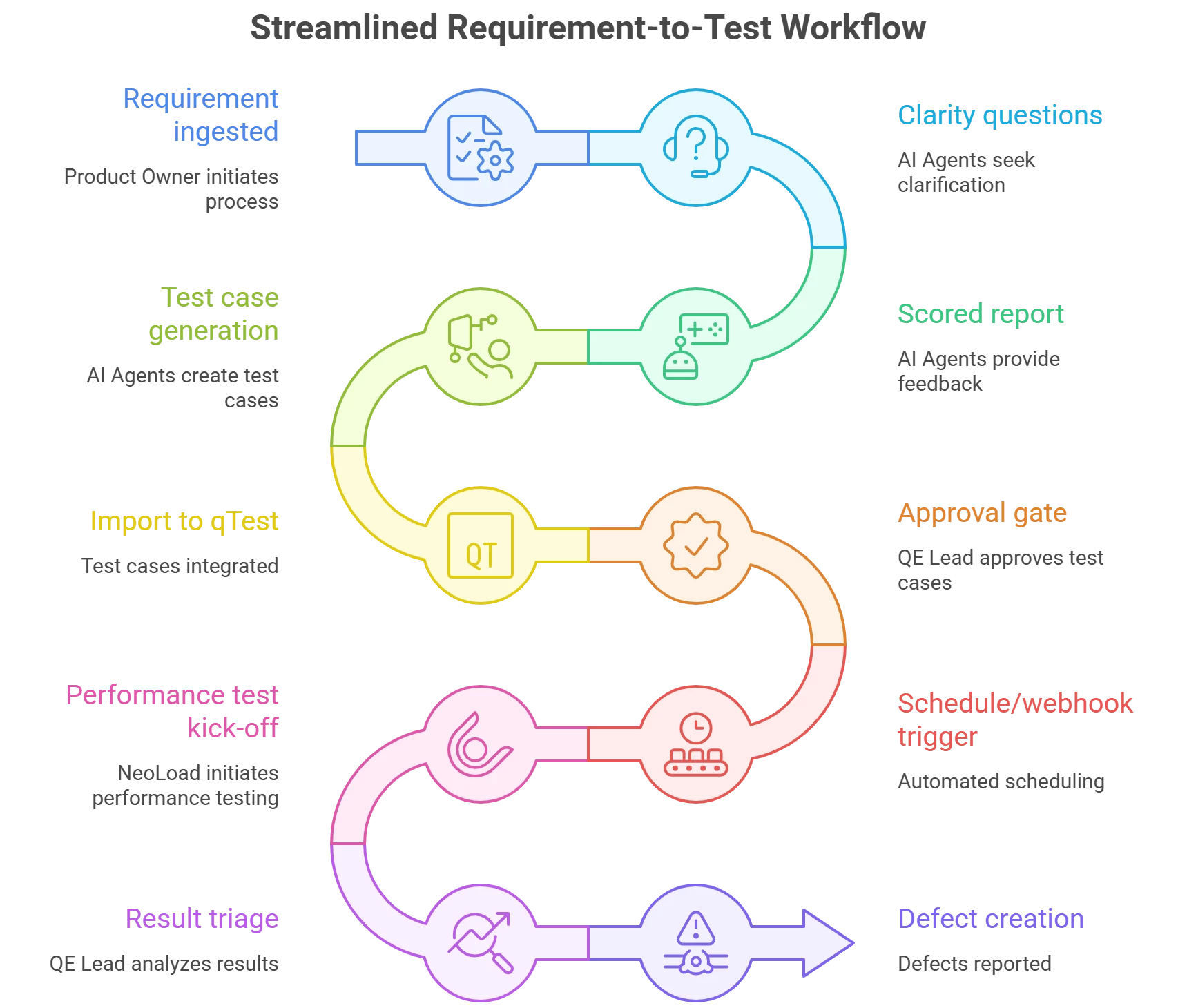 - Example flow: Jira epic → AI requirement analyzer (questions + scoring) → Agentic test generation → Import to qTest → Optional NeoLoad perf plan → Approvals → Defect creation on failures.