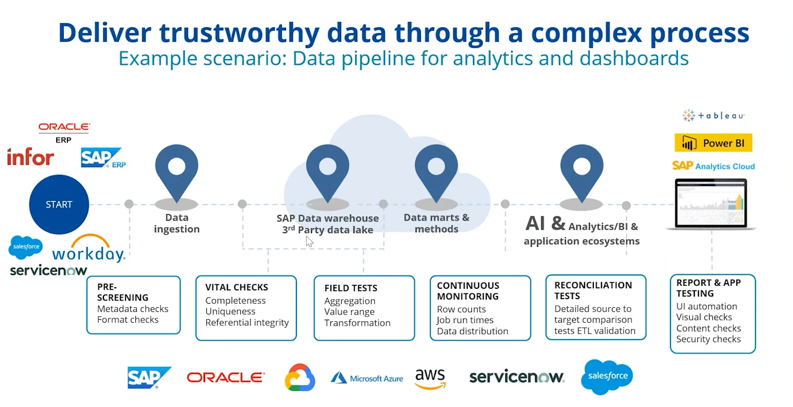 Practically, Tricentis Data Integrity provides a structured approach to catch errors before they impact AI/ML outcomes. It offers out-of-the-box templates and wizards for common data tests, so teams can quickly set up automated checks without reinventing the wheel. For instance, a pre-screening test can instantly flag missing values, duplicates, or misformatted fields as soon as data is loaded, ensuring upstream data is clean. Reconciliation tests can automatically compare data from source to target (even across different file formats or databases) to confirm that no records were lost or altered in transit. The tool also supports business rule tests (sometimes called profiling tests) to verify data makes sense in context – e.g. a test to ensure no active customer accounts have an impossible combination of attributes. By building these validations into the pipeline, Tricentis Data Integrity enables what is effectively a continuous audit of your data’s accuracy. As the Tricentis team notes, the solution provides continuous, automated testing to keep data pipelines reliable even as systems change, and end-to-end visibility so that errors introduced during complex ETL processes are immediately caught.