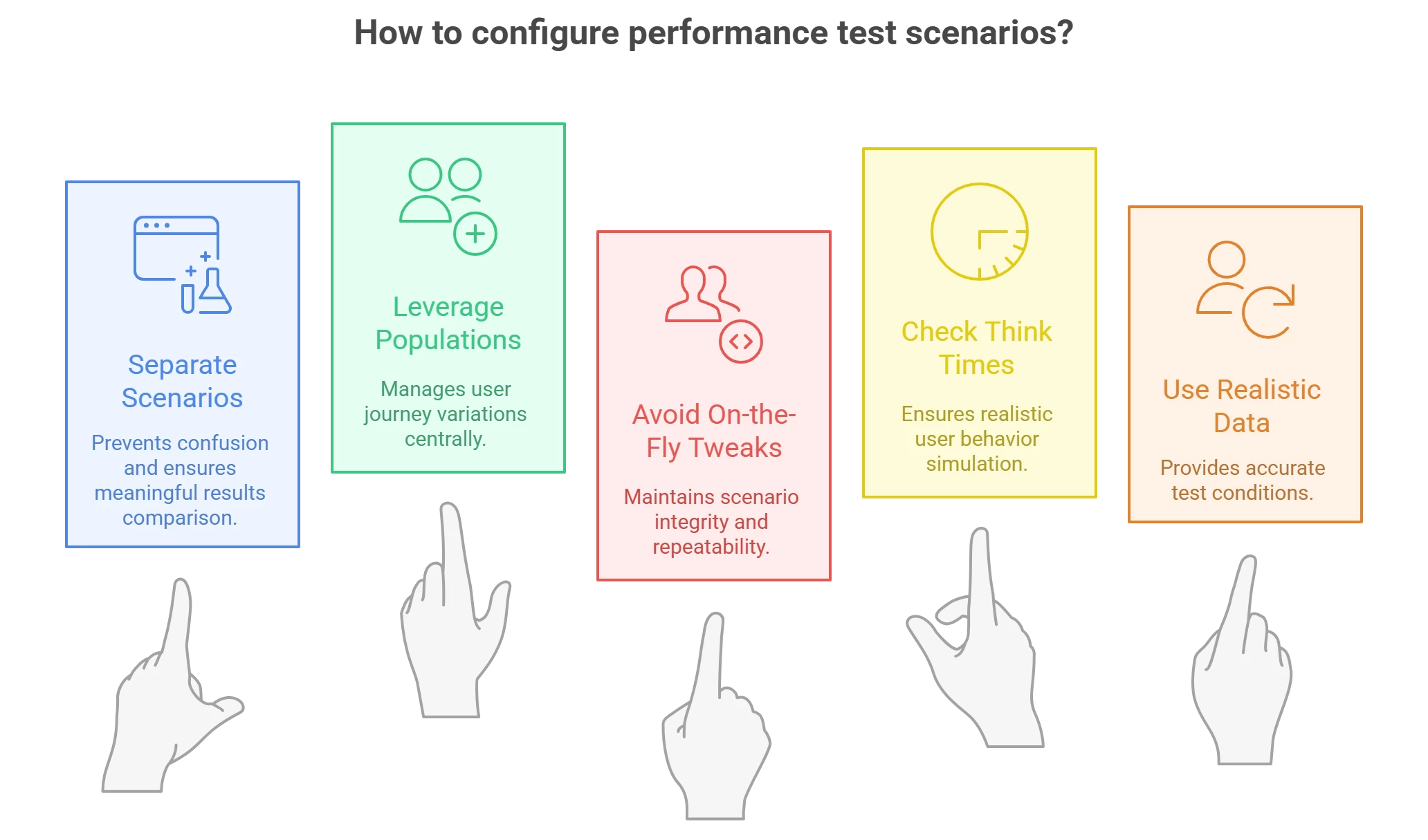 Each of these test types is essentially a variation of load testing with different objectives or slight tweaks in how load is applied. In practice, the differences often come down to small scenario configuration changes, such as how fast you ramp up, how long you run, or how much “think time” you include between actions. To plan effectively, it’s important to define these test types with your team so that everyone has a common understanding. Next, we’ll discuss one of those subtle but crucial factors – think time – and why it has a huge impact on your test results.