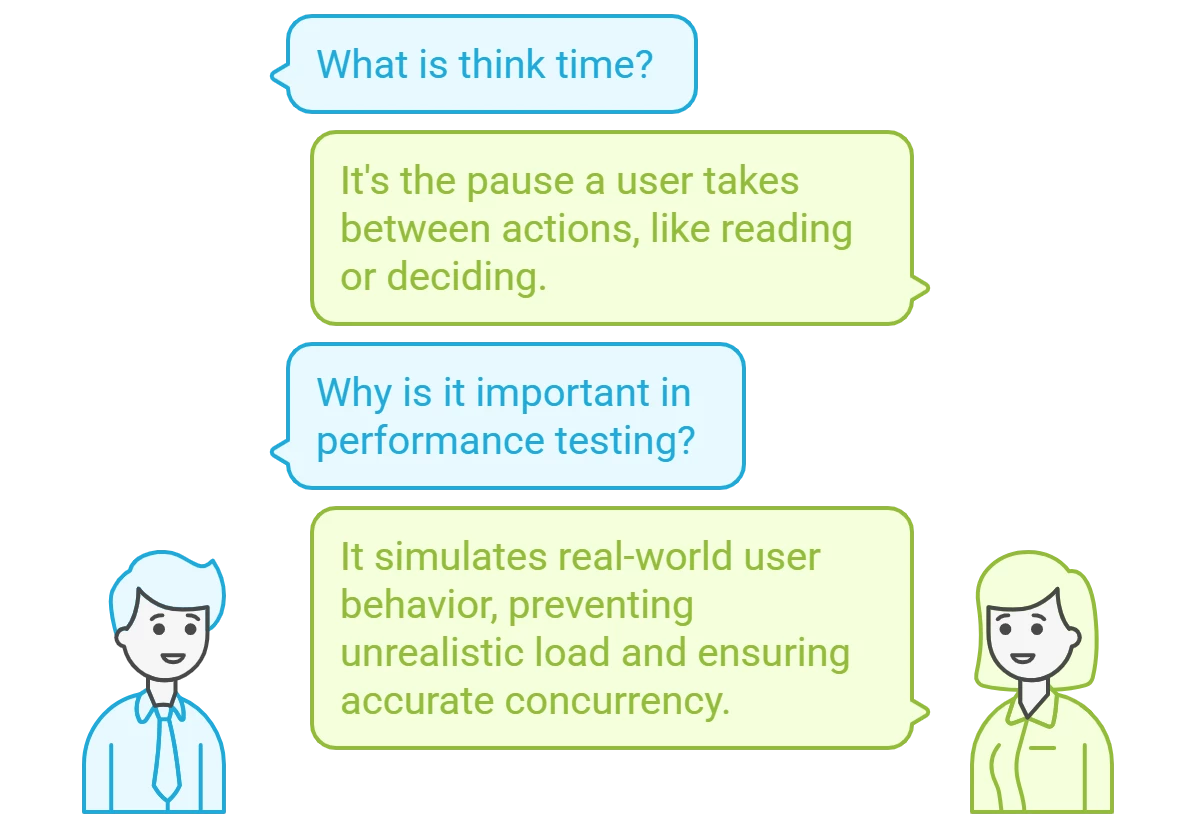 Think time represents the pause a real user naturally takes between actions when using an application. In other words, it’s the time a user spends thinking, reading, or simply hesitating before clicking the next button. Humans don’t hammer applications nonstop; we pause to read content, fill forms, or decide our next step. For example, after a page loads, a user might take 5-10 seconds to digest it before moving on. This delay is modeled as think time in performance tests.