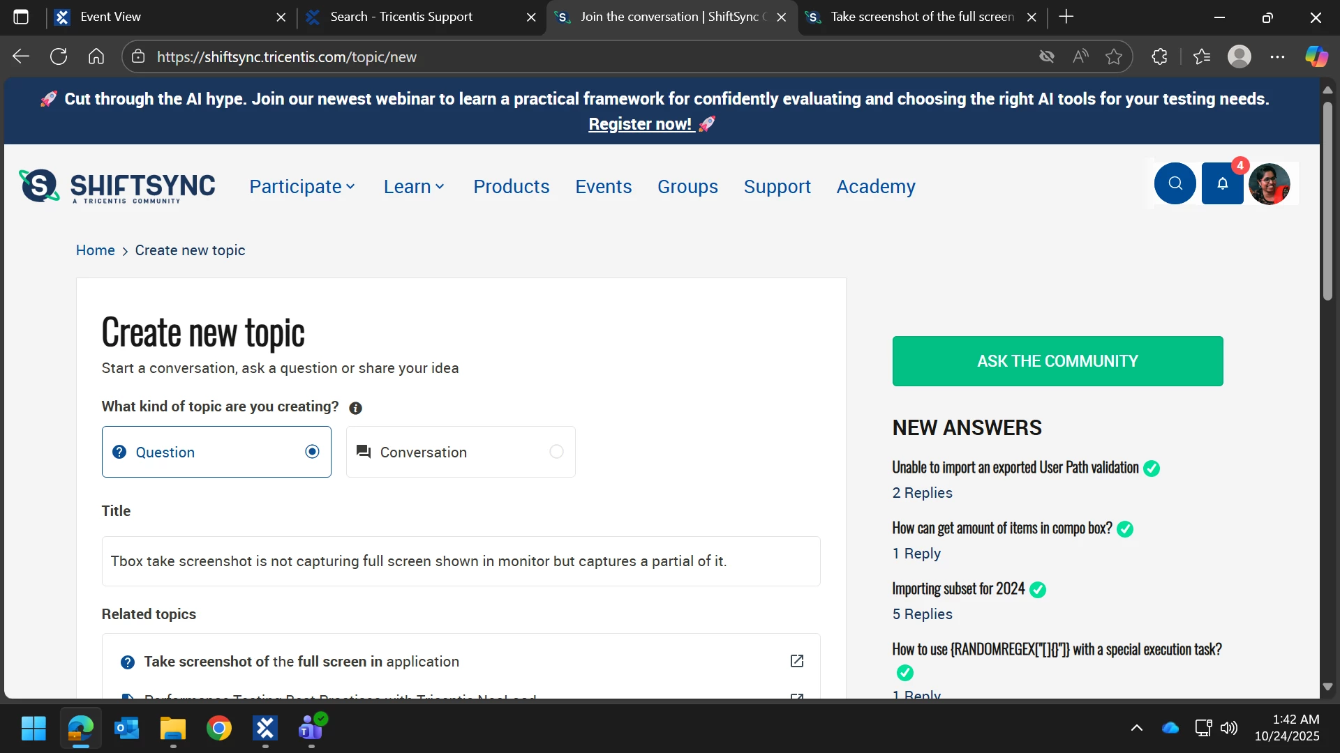 The Screenshot captured by 2024.2 version of Tosca captures partial screen despite the setting for Screen set to everything. Could you please guide me with the issue here?