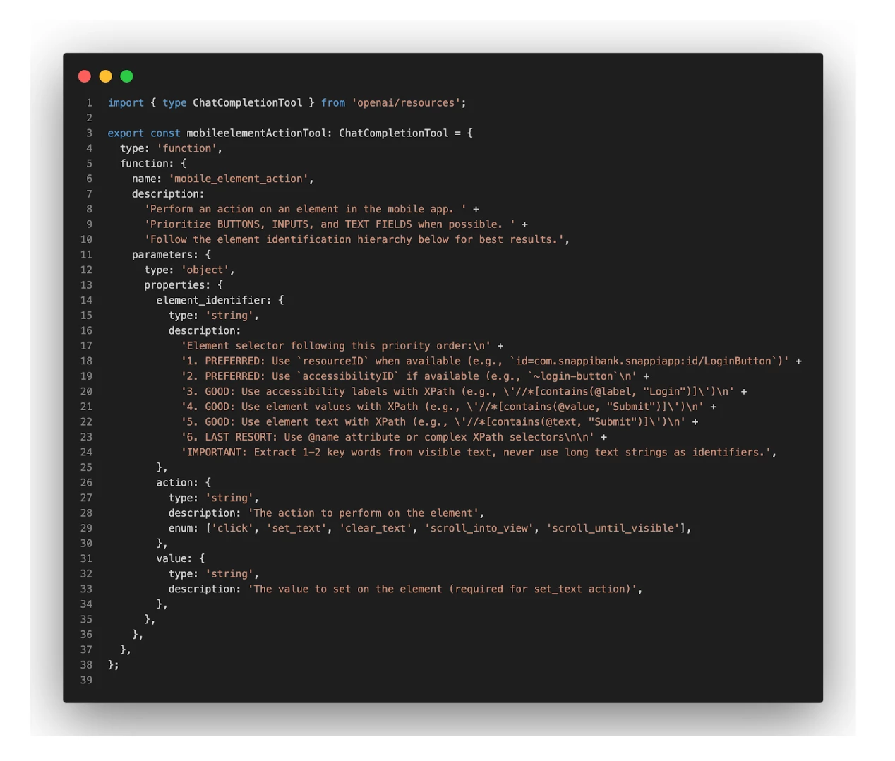 The dictionary is the so-called ChatCompletionTool which is a tool the AI is allowed to call to perform various actions/operations in mobile devices. It’s the link between Appium API and OpenAI for example: