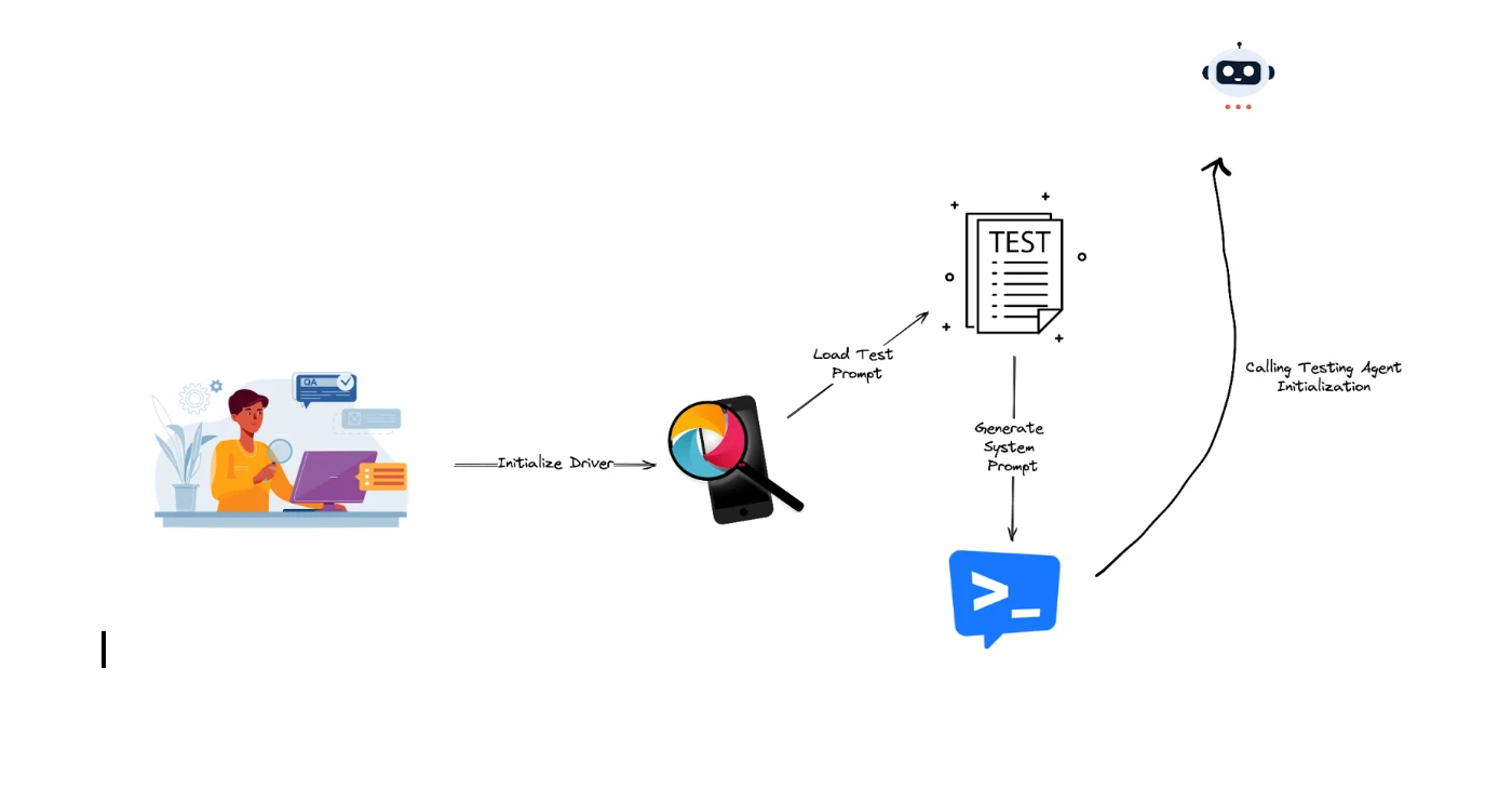 - Call Testing Agent Initialization: orchestrates the loop—read intent → plan → act via Appium → evaluate → report—returning actionable results