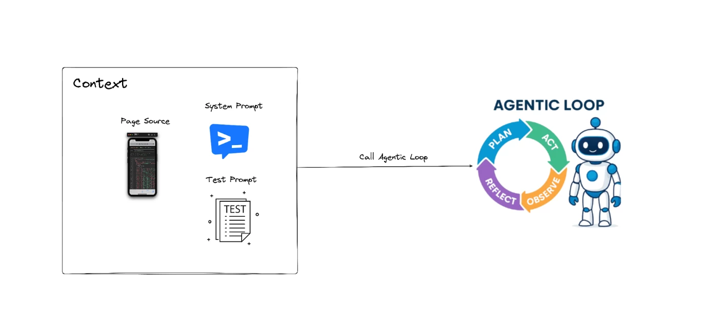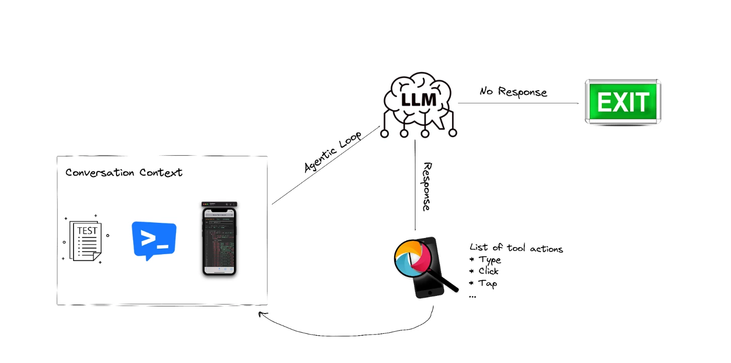 Once this context is assembled, then we enter the actual agent loop, which drives the flow-think‑act‑observe-repeat cycle that powers autonomous app testing.