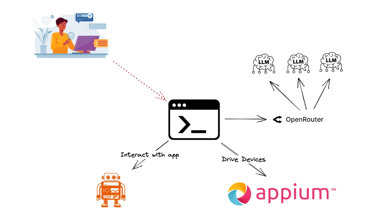 Let’s have an overview of the architecture of our solution to better understand why we followed this approach. Our solution was to create a CLI program that uses the OpenRouter API to connect to various LLMs, WebdriverIO and Appium to interact with Native Mobile Apps. As we described earlier we already had our testing framework running in this stack for months and wanted to experiment with a simple yet powerful integration.